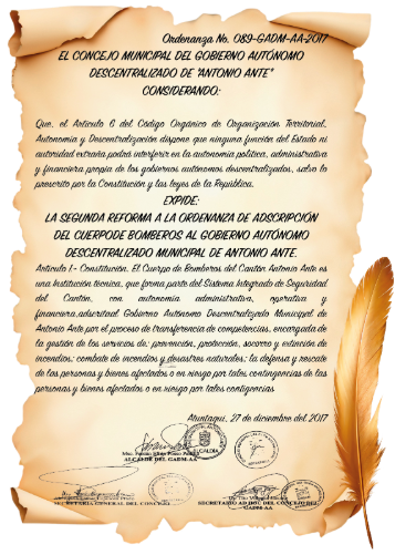 Pero un nuevo capítulo en la historia del Cuerpo de Bomberos de Antonio Ante comenzó en el año 2017, cuando el Gobierno Autónomo Descentralizado Municipal de Antonio Ante aprobó la Ordenanza Nro. 089-GADM-AA2017. Este instrumento legal otorgó a la institución autonomía administrativa, operativa y financiera, marcando un antes y un después en su desarrollo. Con esta decisión, el Cuerpo de Bomberos de Antonio Ante dejó de depender directamente de estructuras externas para su funcionamiento, y adquirió la capacidad de gestionar sus propios recursos, definir sus estrategias operativas y fortalecer su infraestructura con mayor agilidad y eficacia.